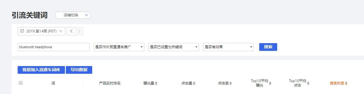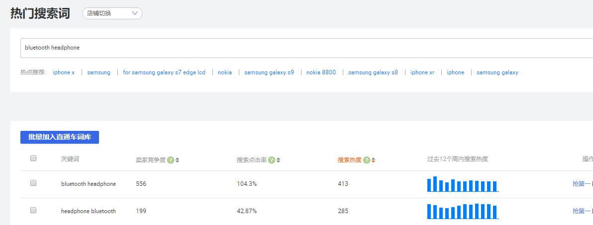 进入后台数据管家-热门搜索词,查找bluetooth headphone,把所有关键词拷贝到Excel表格中。有软件就用软件下载,没软件就手动。或者用插件提取:阿里巴巴国际站运营工具利用xpath插件提取关键词或标题 或 Firefox火狐浏览器插件TableTools2