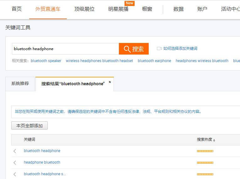 进入直通车-关键词工具,查找bluetooth headphone,把所有关键词拷贝到Excel表格中。