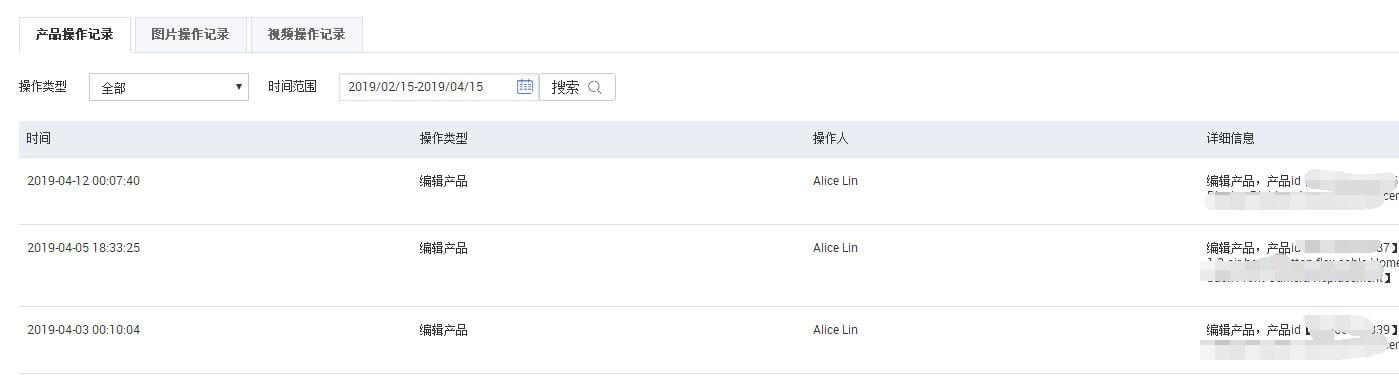 产品操作记录、图片操作记录、视频操作记录
