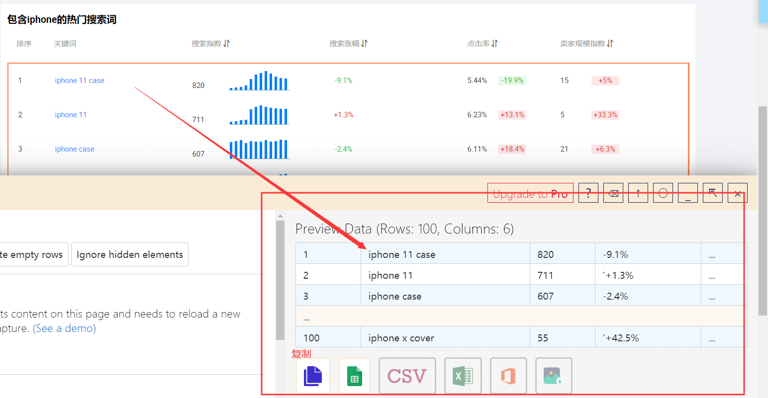以上举例关键词指数,P4P同样操作即可,该插件可采集所有网页中的表格内容。