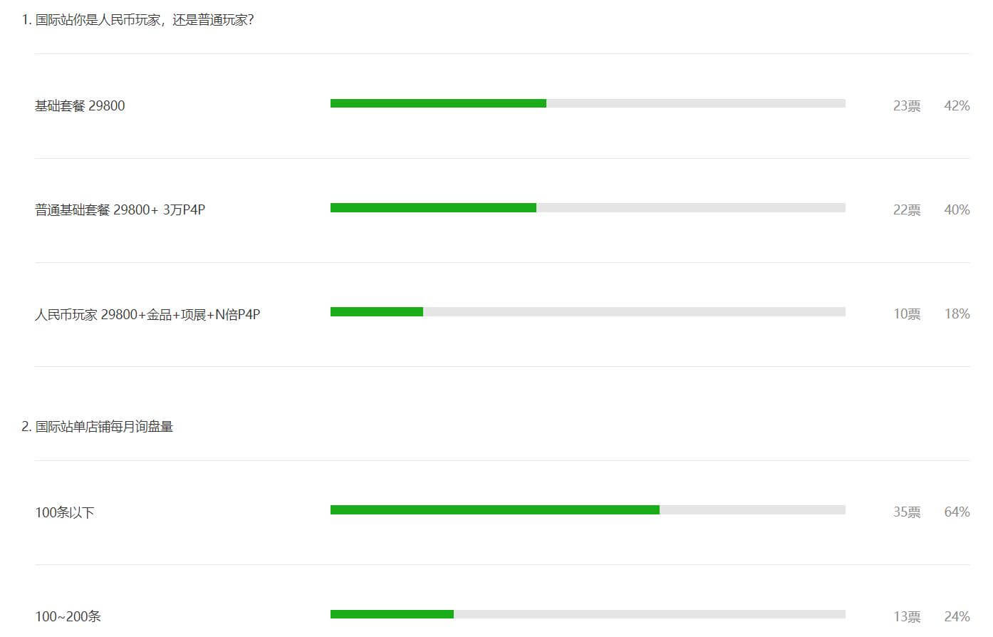 一共有55位朋友参与投票,其中有64%的公司月破百难,有42%的公司还在使用着基础套餐29800,没有充P4P,看到这两个数据,当时我也吓了一跳,现在不管是做任何渠道,不投钱,确实难做。