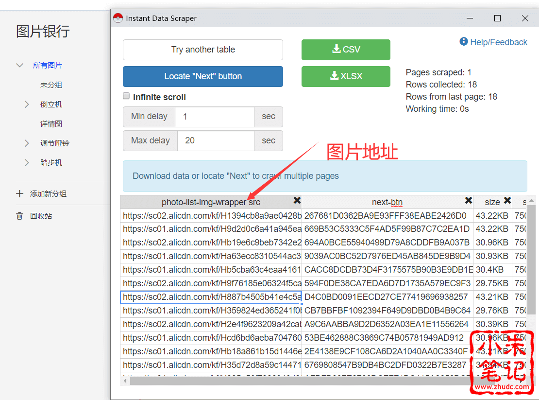 1、打开Instant Data Scraper,采集图片银行中的图片地址,采集完毕,选择excel格式下载到电脑中。