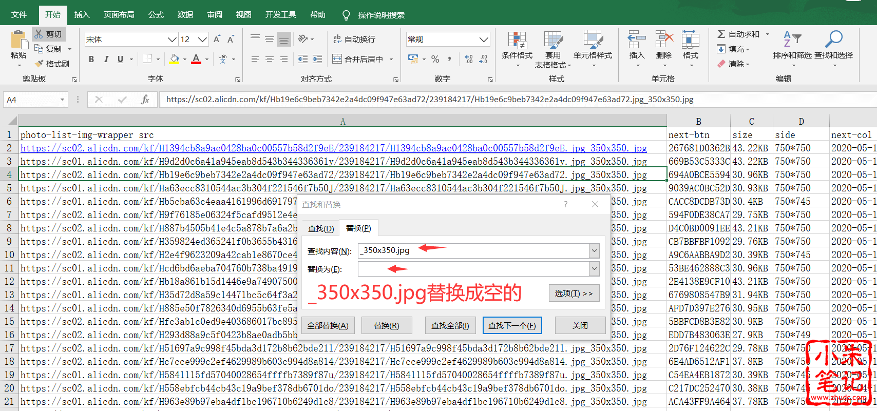 2、打开下载图片的excel表格,处理网址,默认采集的图片地址是缩略图,把图片地址最后_350x350.jpg替换成空后就是原始图片大小,然后在利用迅雷下载。