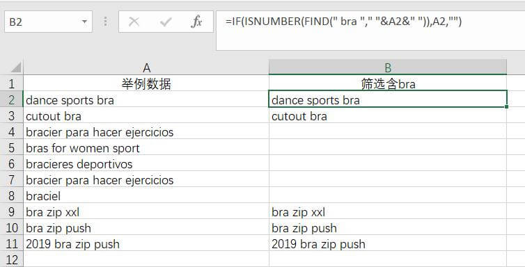 例如有一列关键词关于:bra。如果利用普通的筛选方式,会把braxxxx的关键词也筛选出来。我只需要关于bra精准词。