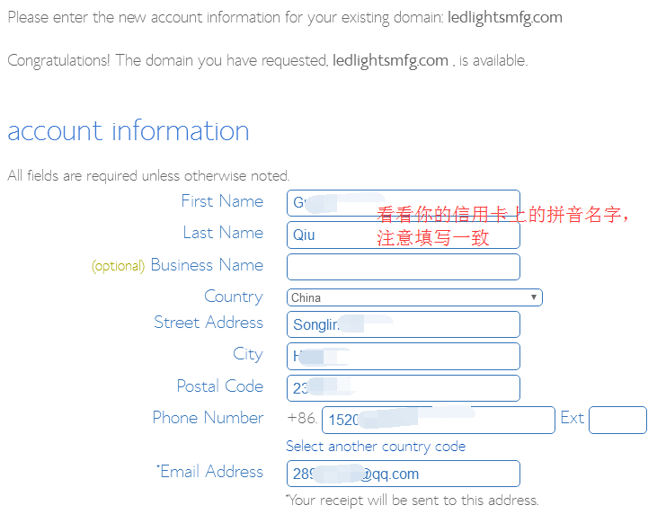 然后你就可以填写下面的表单进行购买了。注意 account information 的表格,姓名地址联系电话尽量填写真实的,BlueHost 对账户真实性的审核有一定标准。