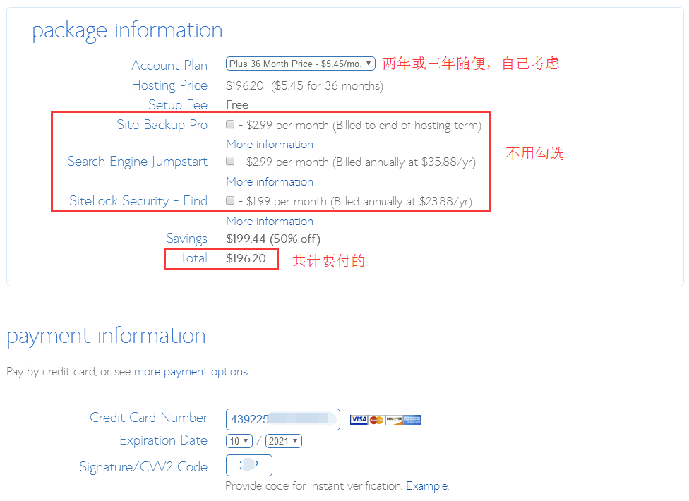 5)选择购买的服务以及支付方式,需要注意的是 Bluehost 会自动带你勾选三个额外收费的服务,一般情况下外贸空间是不需要的,你需要把勾给去除掉,否则会被收费。