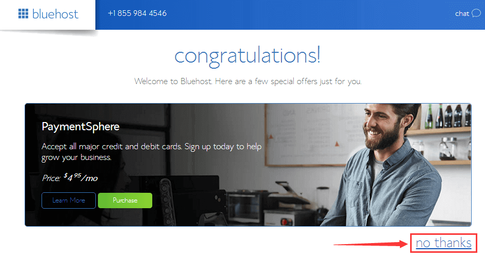 7)页面会跳到一个 Bluehost 促销 PaymentSphere 的页面,这是 Bluehost 玩的再销售,我们直接无视点击 No, thanks。