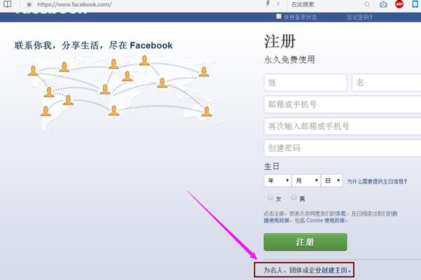 1.打开Facebook注册申请页面(当然了如果你上不了Facebook,进行上网配置。),看到注册按键下方有个为名人,团体或企业创建主页。注册企业版就在这里了。