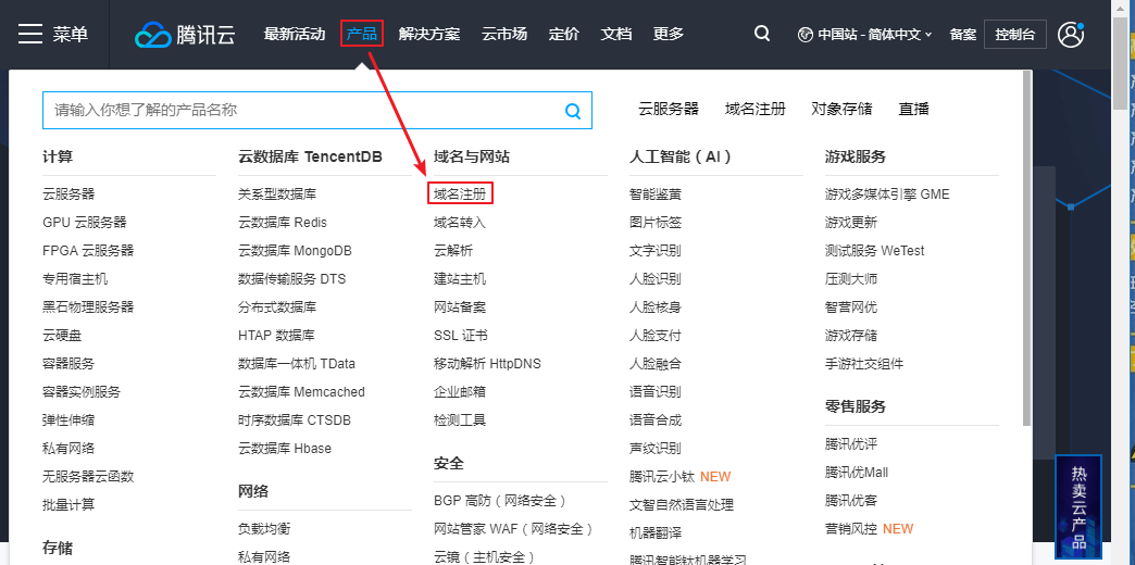• 方式一:在顶部导航栏依次打开【产品】>【域名与网站】>【域名注册】,进入域名注册页面。