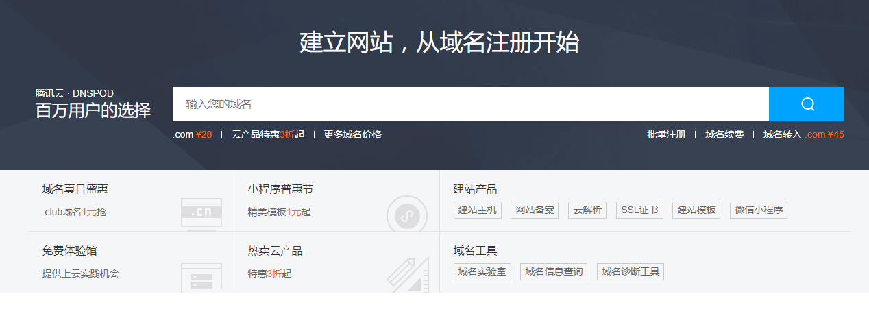 登录 腾讯云官网,您可以选择以下两种方式进入域名注册页面: