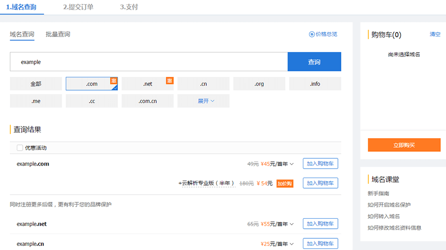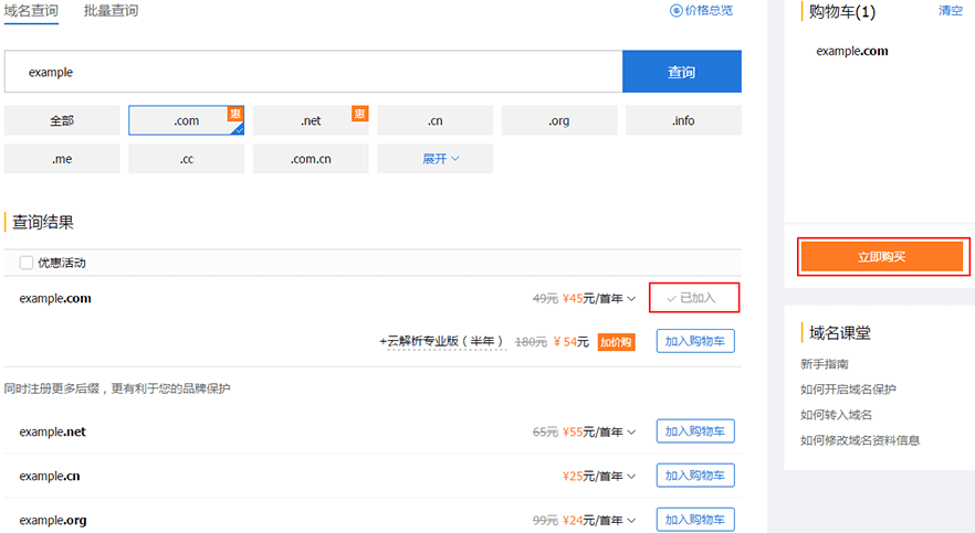 选择您需要注册的域名(如 example.com ),单击【加入购物车】。您也可以选择多个后缀域名(如 example.cn)加入购物车,确认后单击【立即购买】。