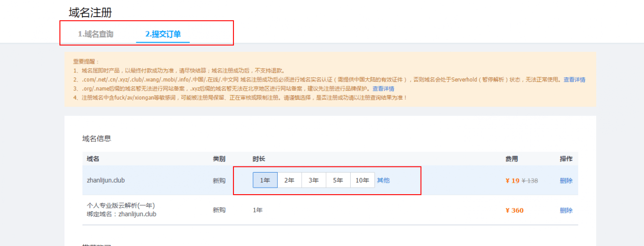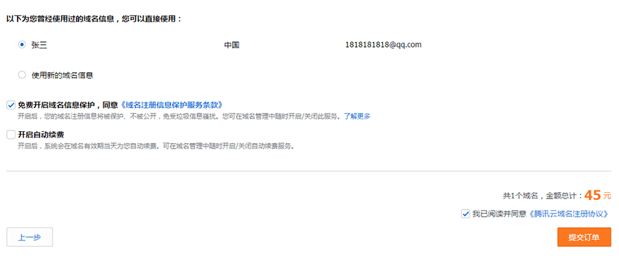 这一步,您需要在提交订单页面确认您的域名购买时长以及填写您的域名信息。
