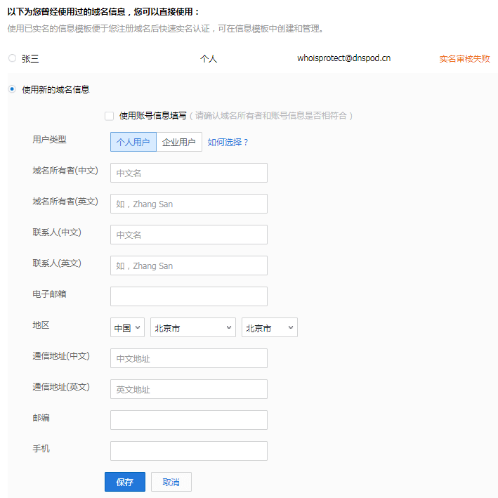 如果您之前购买过域名,选择使用之前填写的域名信息即可;如果您使用新的域名信息,选择【使用新的域名信息】,填写您新的域名信息并保存,具体需填写的信息如下图所示: