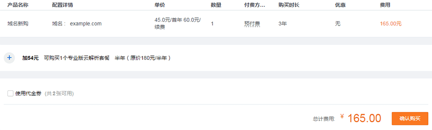 在此,您需要核对您的域名信息、购买时长以及费用,确保信息准确无误。核对完成后,单击【确认购买】进入支付页面。