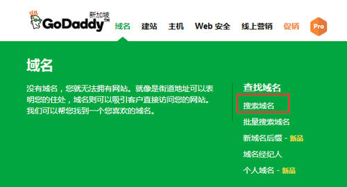 一、进入Godaddy官方网站,从导航里进入“搜索域名”页面;