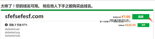 - 如果域名已经被注册,会有提示,需要重新搜索其他域名。如果域名提示可注册,直接点击后面的“选择”按钮选中域名并添加到购物车;