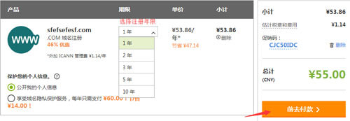 - 选择注册年限,核对注册价格,如果没有问题再点击“前去付款”;
