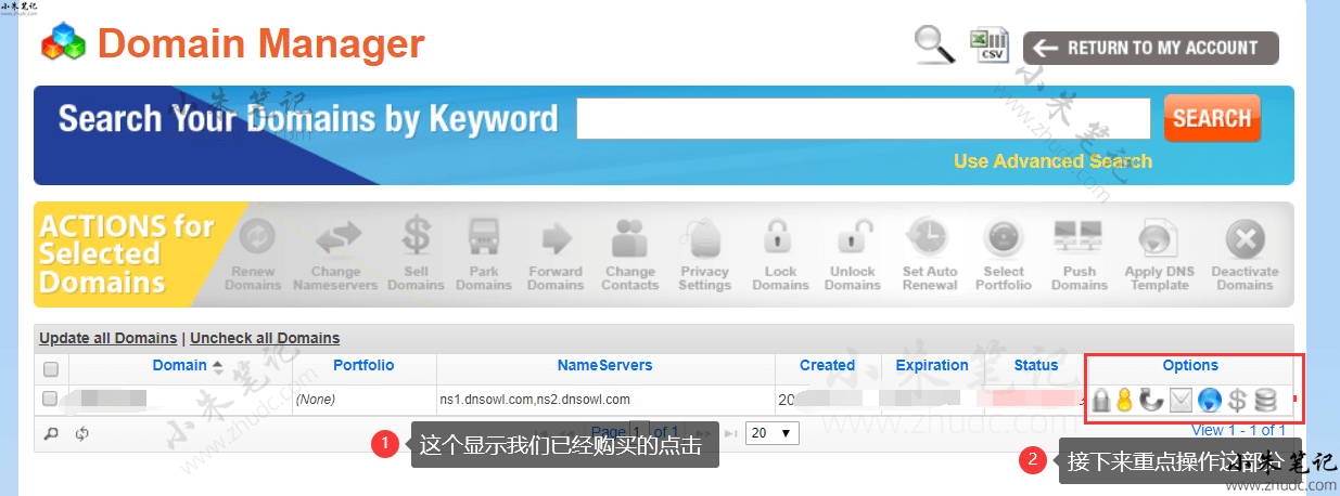 1、登入Namesilo 之后,会自动转到管理页面,点击Account domains后面的1 或者 点击侧边菜单domain manager,进入域名管理。