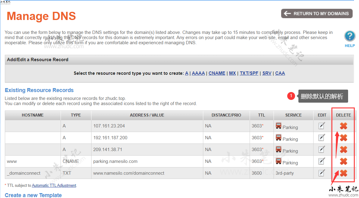 进入 DNS 解析页面后,Namesilo默认有几条解析记录,先把这几条已存在的 解析记录都删除,清空。(删除不掉,有提示,没关系,多点几次就能删除)