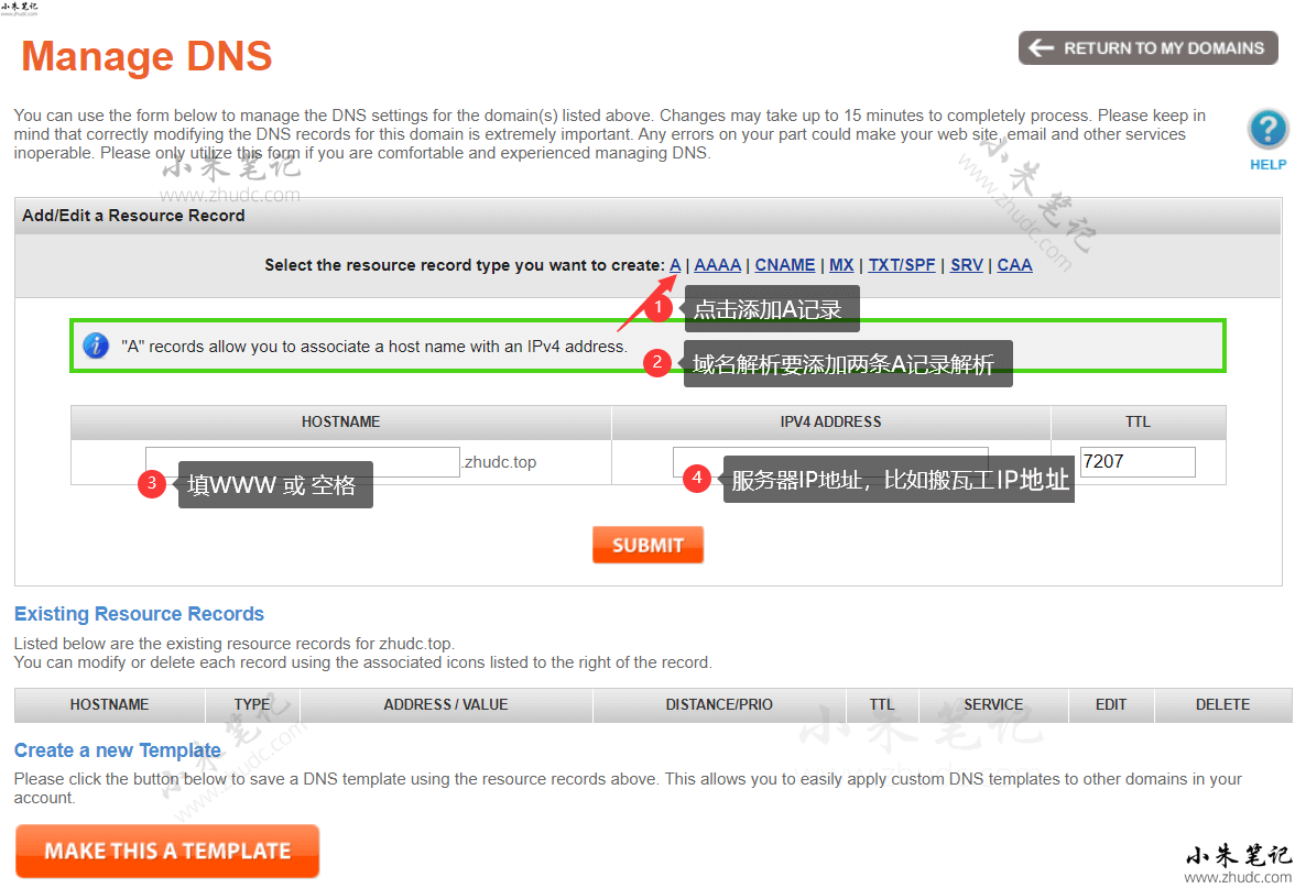 第二个在Hostname 处填写 www,并在 IPV4 ADDRESS 那里输入服务器 IP地址 ,点击 SUBMIT。