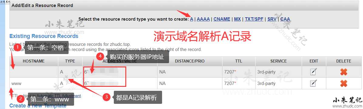 删除默认解析后,点击上方的 Add/Edit a Resource Record 里的 A,开始添加解析A记录。:
