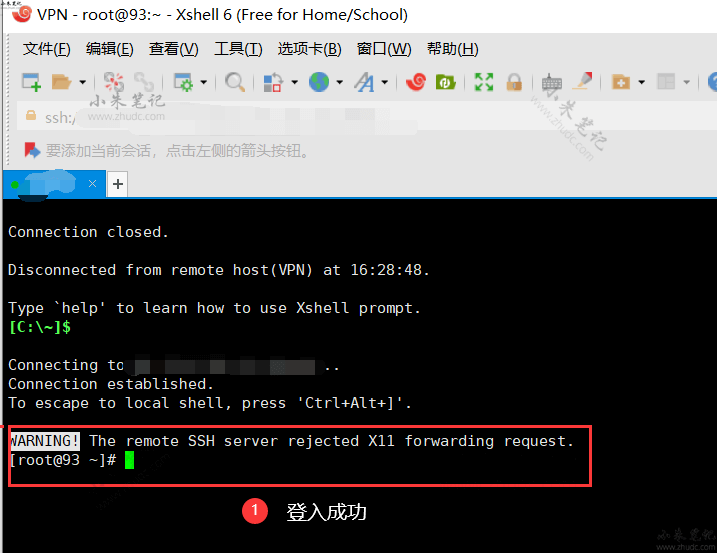 5、如果xshell面板中出现以下提示.则表示连接成功.如果提示密码不对,就要检查密码,必要时手动输入密码.