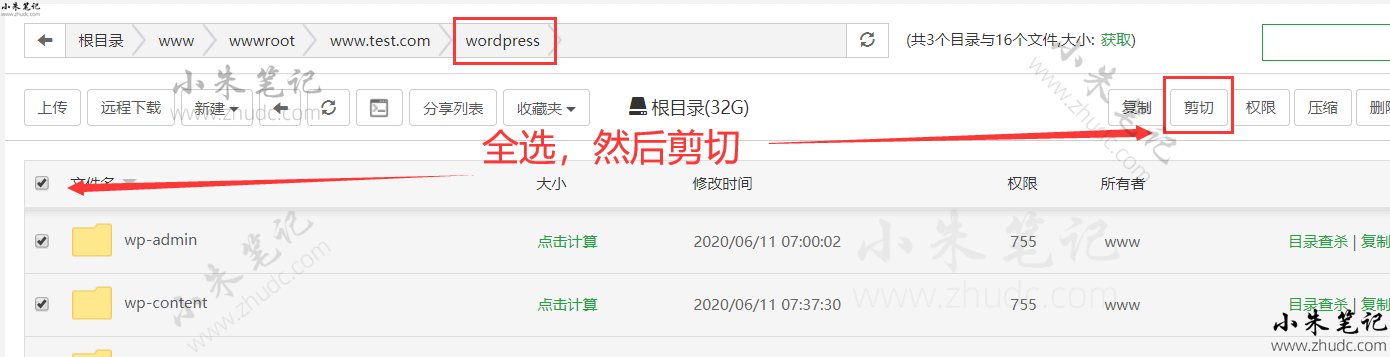 6、进入WordPress文件夹,全选所有文件,然后点击剪切。