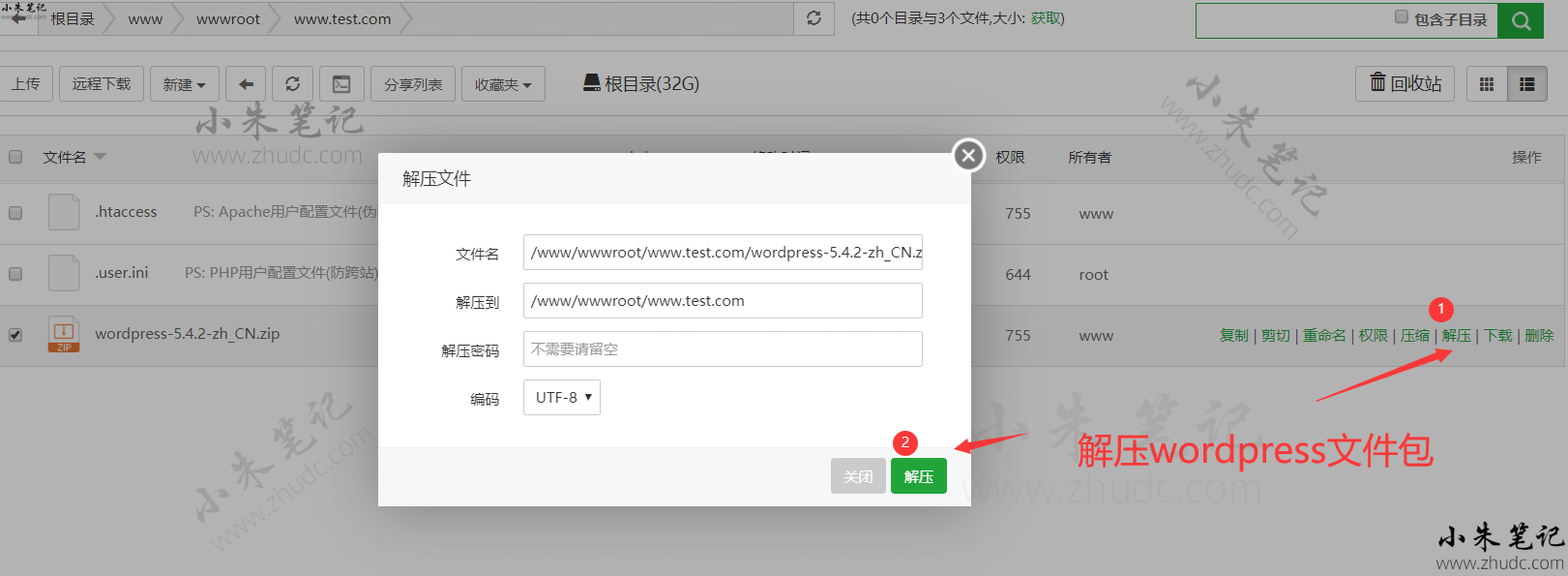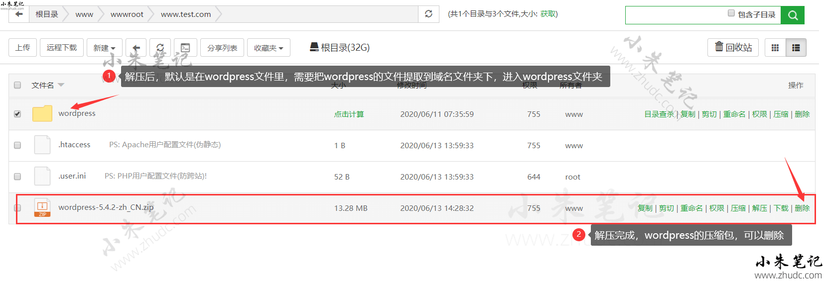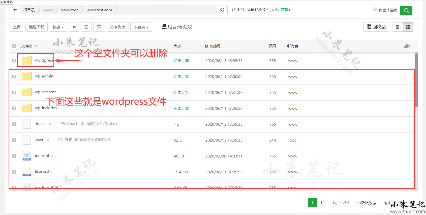 8、参考下图,WordPress文件已经移到域名文件目录下。解压的WordPress文件夹空了,可以删除。