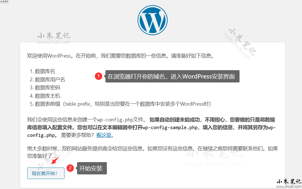 WordPress文件已经上传完成,域名已经解析到服务器,开始安装WordPress。