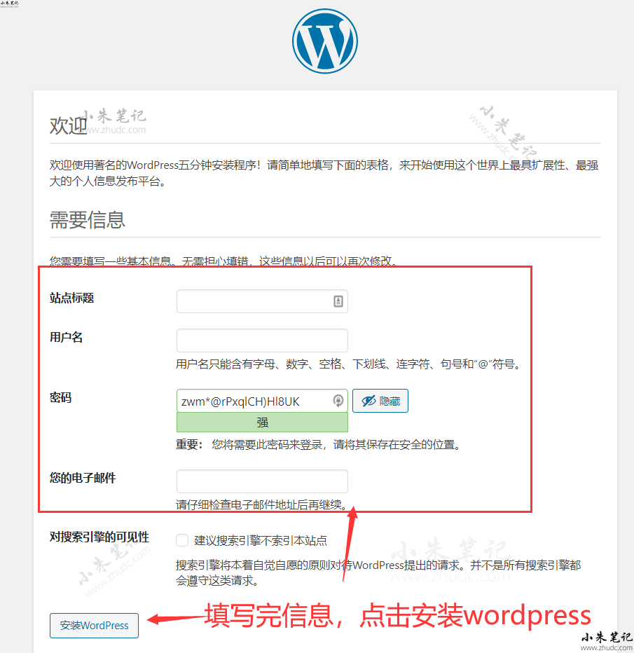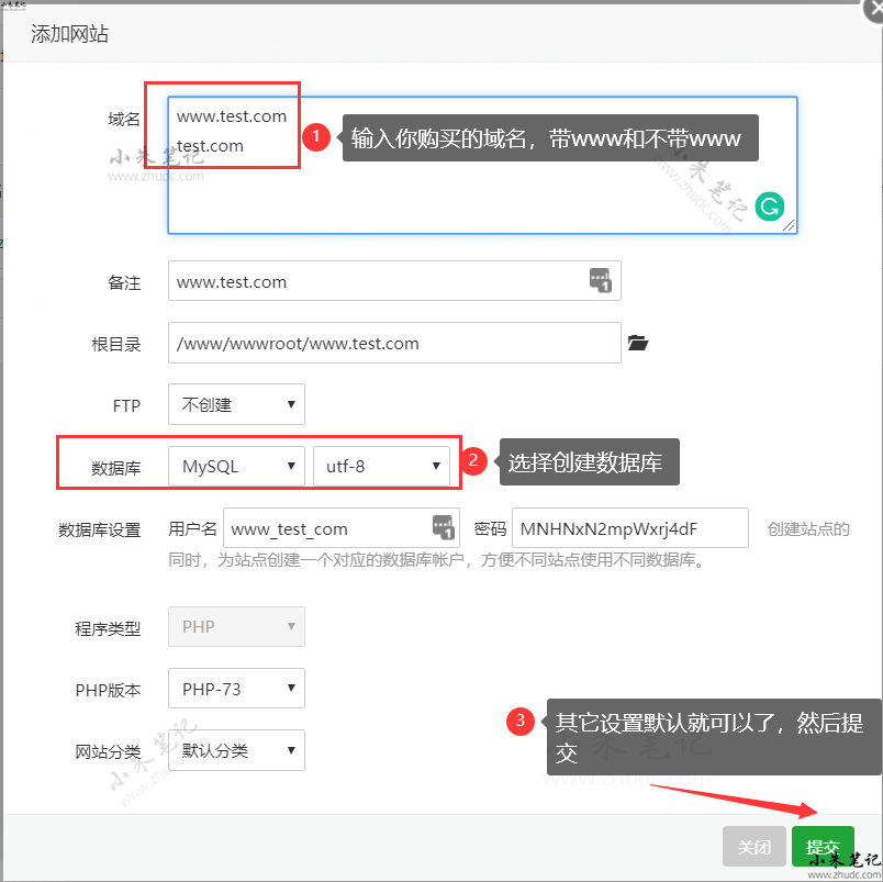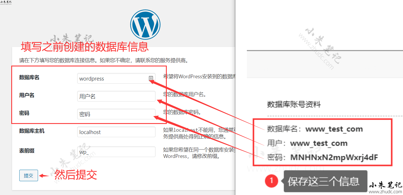 3、成功创建站点之后,建议我们把这里弹出的提示信息都记录下来,数据库名、数据库用户、密码,后面都会用到的。