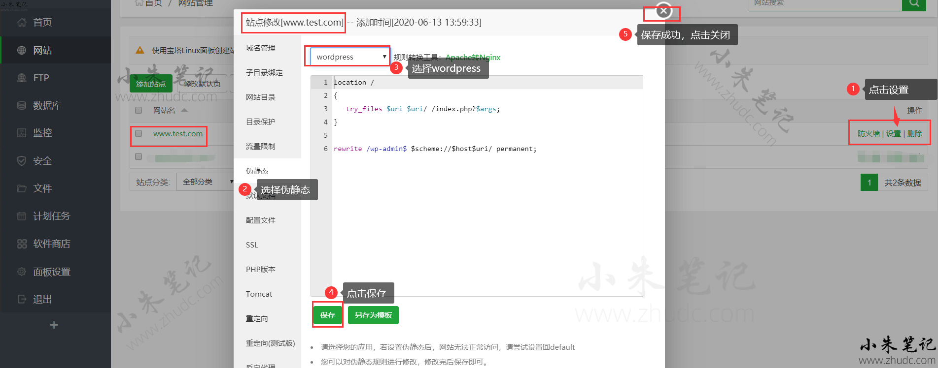 4、选择创建的域名,点击后面的设置按钮,选择伪静态,选择wordpress保存。