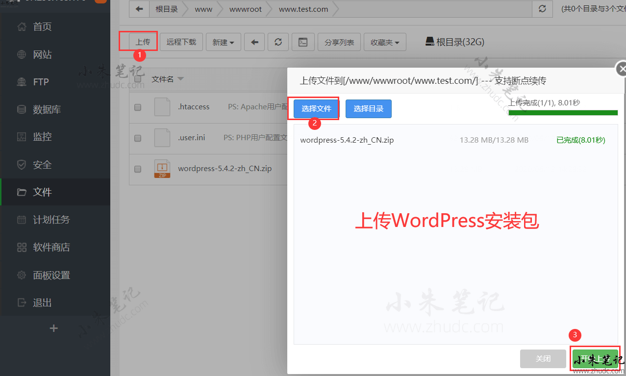 3、上传WordPress安装包。点击下载WordPress安装包 或者官方下载,下载地址:https://cn.wordpress.org/download/