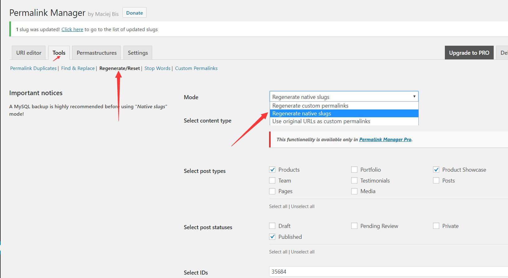 在tools–Regenerate/Reset–mode–Regenerate native slugs–选择产品或文章,启动重新生成slug