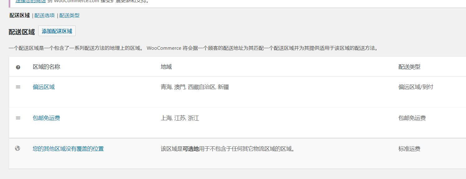 配送区域是指不同的地区可以设置不同的运费,以上所有配送类型均可在不同的区域使用不同的费用进行配送费用计算。